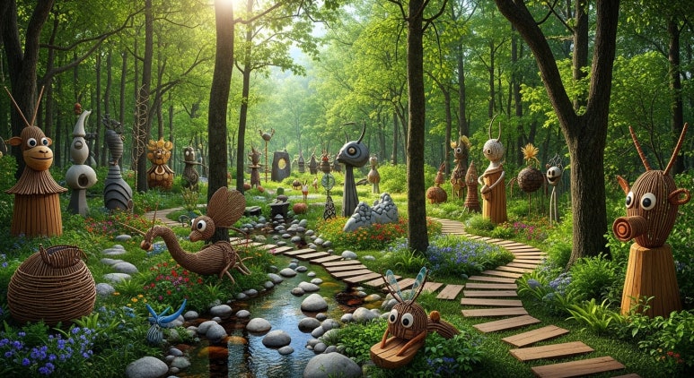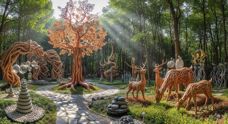 [Image: A beautiful forest garden designed with artistic structures and carbon-neutral plant species]